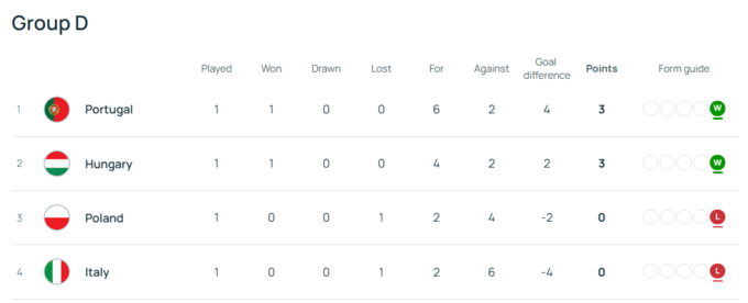 После первого тура Португалии располагается на первом месте группы с тремя благодаря поебде над Италией со счетом 6:2. Венгрия идет торой, также имея три балла за победу над Польшей.