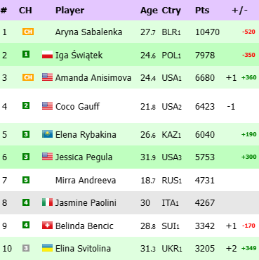 В режиме «лайв» Элина поднялась на 10-е место. В ее активе сейчас 3205 очков после выход в полуфинал Australian Open 2026.