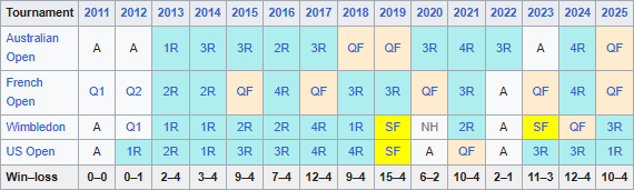 - Aus Open 34–12, Roland Garros 33–12, Wimbledon 22–11, US Open 24–12