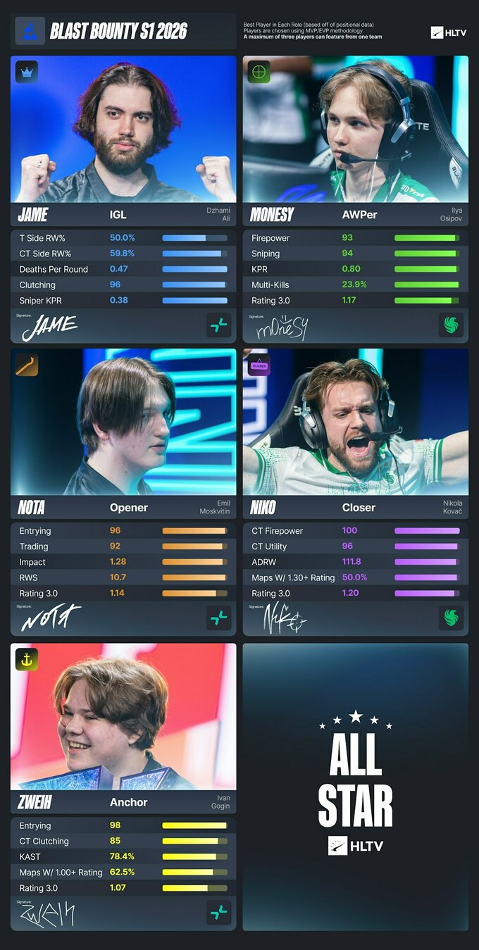 В символической сборной турнира роли распределились следующим образом: NiKo остался клоузером как MVP, nota стал лучшим энтри после фантастического финала, m0NESY получил место основного AWP с лучшим показателем KPR (0,80), Jame отвечал за лидерство и тактическую составляющую, а zweih закрыл позицию анкера, завоевав свой второй титул BLAST Bounty.