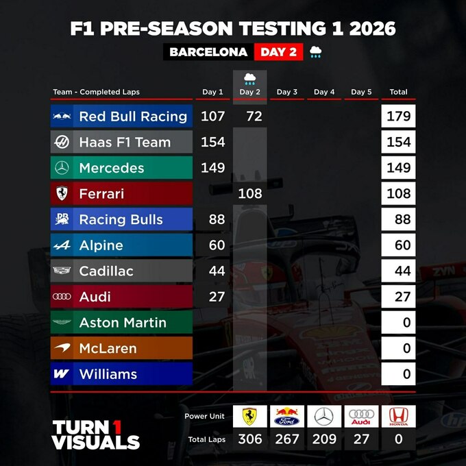 Второй день предсезонных тестов в Барселоне прошел с участием только двух команд, которые работали на трассе в течение дня.