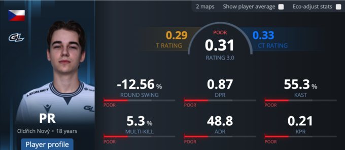 После сильного дебютного сезона в 2025 году PR не смог адаптироваться к новой системе Януша «Snax» Погожельского, возвращению на anchor-позиции и уходу ментора Эшли «ash» Бэтти. За серию он сделал всего 8 фрагов за 38 раундов, опустившись до 0.86 рейтинга в 2026 году.