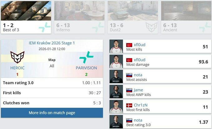 Выступление Олдржиха «PR» Нового на IEM Krakow в 2026 году продолжило спад: чешский рифлер провел одну из худших серий в карьере, показав 0.41 рейтинга на Nuke и карьерный минимум — 0.24 на Dust2 в поражении GamerLegion от Aurora со счетом 0:2.