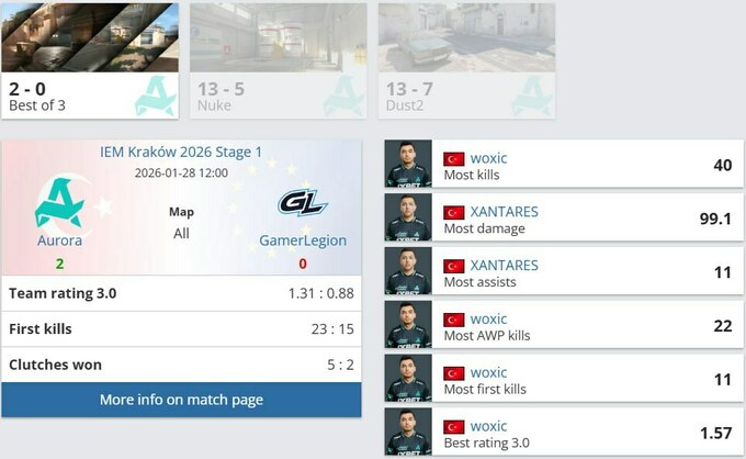 Aurora взяла реванш за поражение на BLAST Bounty. Лидером команды стал Озгюр «woxic» Экер на Nuke, а Исмаилджан «XANTARES» Дерткардеш доминировал на стороне атаки и на Dust2 (1.62 рейтинга). Новичок Канер «soulfly» Кесиджи провел уверенную серию с рейтингом 1.23.