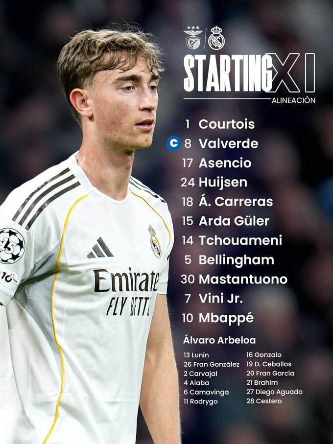 Жозе Моуриньо в атаке Бенфики выпустил одного центрального форварда – Вангелиса Павлидиса. У подопечных Альваро Арбелоа в атаке сыграют Винисиус Жуниор, Франк Мастантуоно и Килиан Мбаппе.