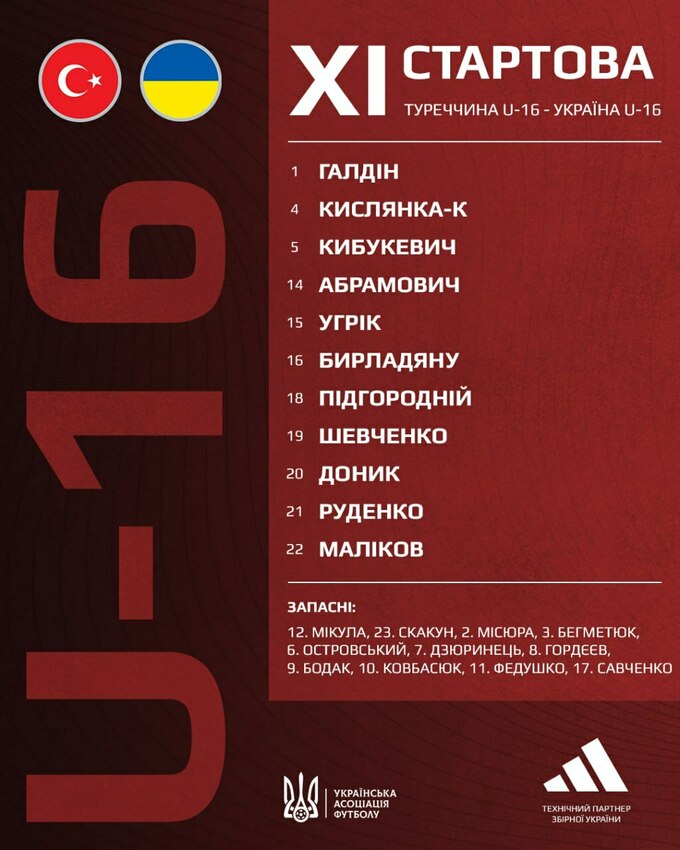 Украина U-16: Галдин (Скакун, 46), Кислянка (к), Кибукевич (Мисюра, 46), Абрамович (Бегметюк, 62), Угрик (Савченко, 46), Бирладяну (Островский, 46), Подгородний (Дзюринец, 46), Шевченко (Бодак, 46), Доник (Ковбасюк, 62), Руденко (Федушко, 46), Маликов (Гордеев, 46).