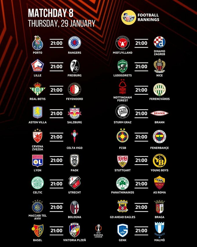 Вечером 29 января пройдут матчи 8-го тура основного раунда Лиги Европы УЕФА 2025/26.