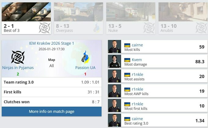 Ninjas in Pyjamas сохранили шансы на выход в следующую стадию IEM Krakow, обыграв Passion UA – киберспортивную команду украинского футболиста Александра Зинченко. Серия завершилась со счетом 2:1: Passion UA взяли Overpass (13:8), однако NiP ответили уверенными победами на Nuke (13:5) и Anubis (13:10).