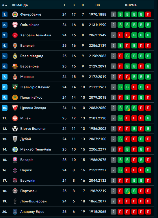 Евролига. Смена лидера, поражение Хапоэля, победы Фенербахче и Олимпиакоса