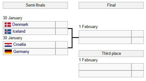 Полуфинальные матчи пройдут 30 января: Германия – Хорватия, Дания – Исландия. Эти игры определят пары в финале и матче за бронзу.