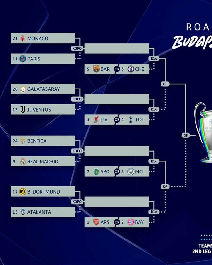 Мадридский «Реал» (Андрей Лунин) сыграет против португальской «Бенфики» (Анатолий Трубин и Георгий Судаков) а ПСЖ (Илья Забарный) встретится с французским «Монако».