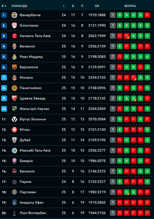 30 января в рамках 25-го тура регулярного чемпионата Евролиги состоялись четыре матча.