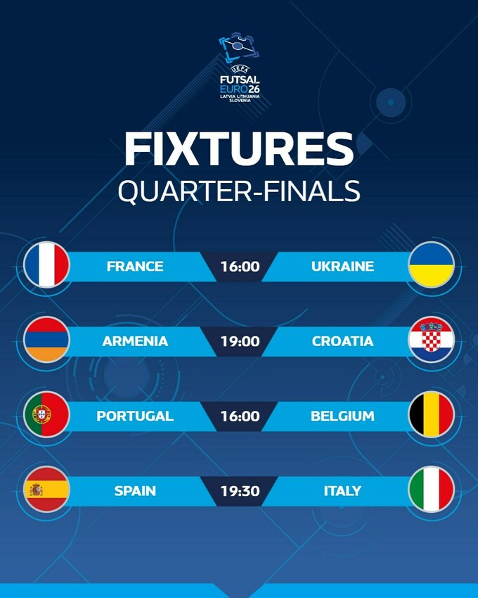 Матч 1/4 финала Евро-2026 по футзалу Украина – Франция запланирован на 31 января 2026 года. Игра состоится в латвийской Риге на Xiaomi Arena, а начало – в 17:00 по киевскому времени. Победитель матча выйдет в полуфинал на Португалию или Бельгию.