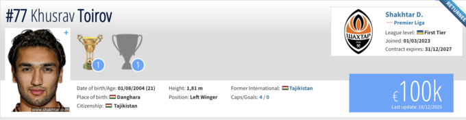 Права на Тоирова принадлежат донецкому «Шахтеру», в расположение которого он вернулся, так и не сыграв за одесситов ни одного матча в первой половине чемпионата Первой лиги 2025/26.