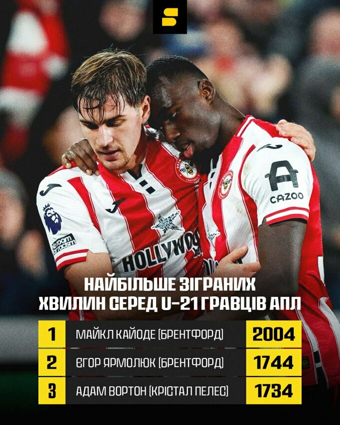 Никто в АПЛ не доверяет своей молодежи больше, чем «Брентфорд». Оба первых места в рейтинге минут среди U‑21 сейчас у игроков из лондонского клуба. Развитие Кайоде и Ярмолюка – важный аспект успешных результатов команды в этом сезоне.