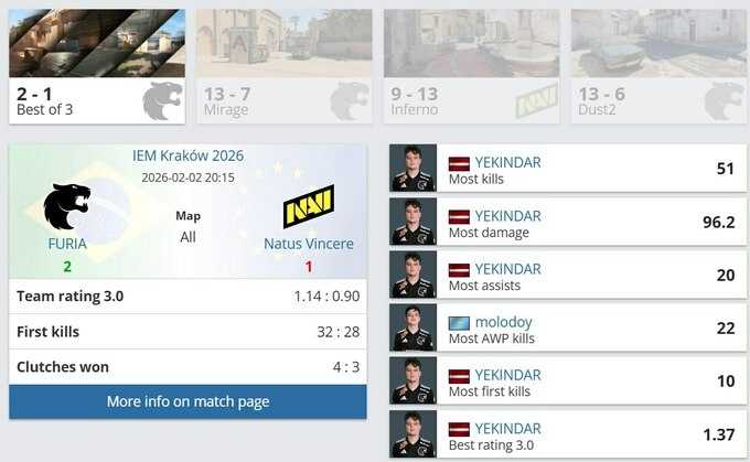 Natus Vincere завершили свое выступление на IEM Krakow, проиграв FURIA со счетом 1:2 в матче нижней сетки группы A. Поражения на Mirage (7:13) и Dust2 (6:13) перечеркнули шансы украинского клуба на плей-оф, несмотря на победу на Inferno (13:9).