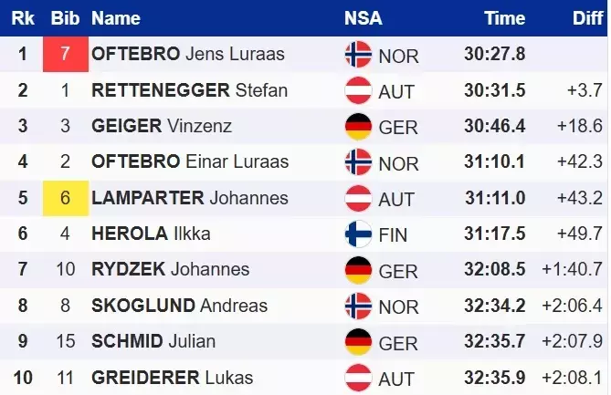 Австриец Штефан Реттенеггер потерял лидерство, уступив 3.7 секунды Йенсу и финишировал вторым, третье место в Гундерсене занял Винцен Гайгер из Германии.