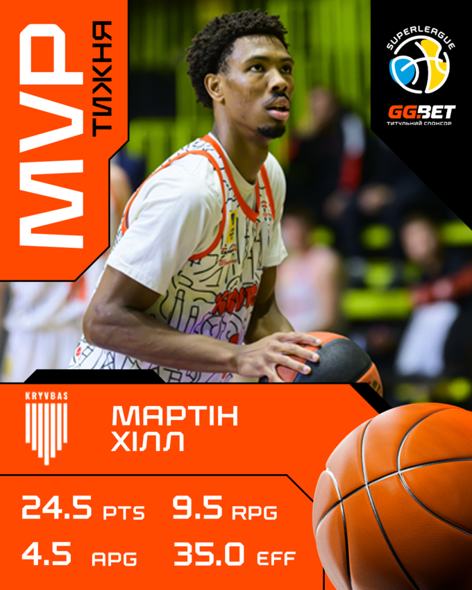 MVP тура признан лидер «Кривбасса» Мартин Хилл. В матче против «Киев-Баскета» (93:86) американец записал в актив 27 очков, 9 подборов, 5 перехватов, 4 передачи и 1 блок-шот, повторив рекорд сезона по показателю эффективности – 37 баллов. Во второй выигранной игре уикенда – против хозяев площадки БК Ровно (108:81) – Хилл сделал дабл-дабл: 22 очка, 10 подборов, 4 передачи и 2 перехвата (РЭ 33).