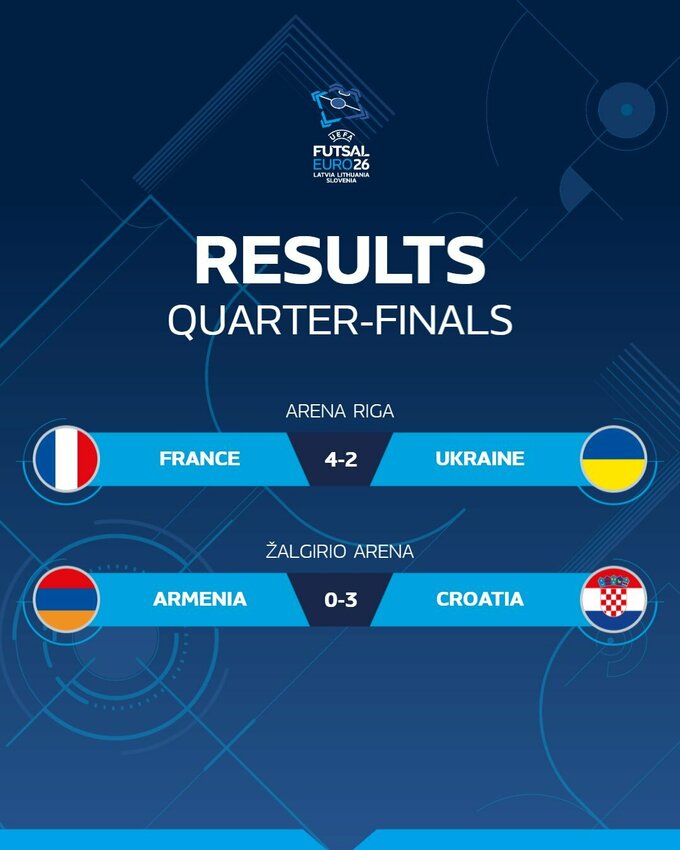 В матчах 1/4 финала 31 января Украина драматично уступила Франции (2:4 ОТ), а Хорватия одолела Армению (3:0).