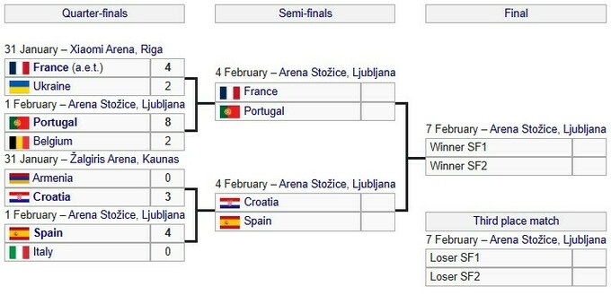 В четвертьфиналах 1 февраля была зафиксирована уверенная победа Испании над Италией (4:0), а Португалия разгромила Бельгию (8:2).