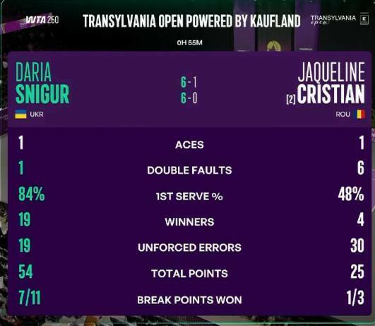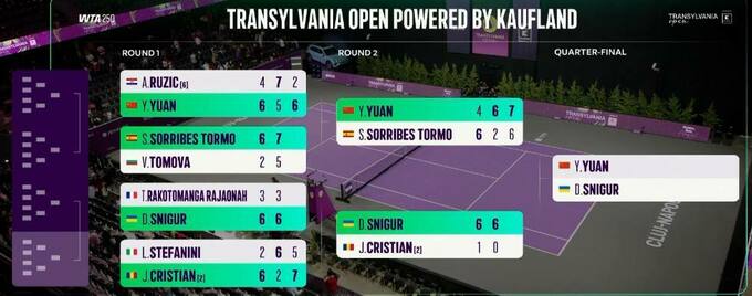 Помимо Снигур, в четвертьфинале соревнований в Клуж-Напоке также сыграет еще одна украинка – Александра Олейникова. Олейникова на своем пути переиграла Маяр Шериф и Анну Бондар, а далее поборется с Ван Синьюй. Дарья и Алекксандра находятся в разных частях сетки, поэтому украиснкое дерби возможно лишь в финале.