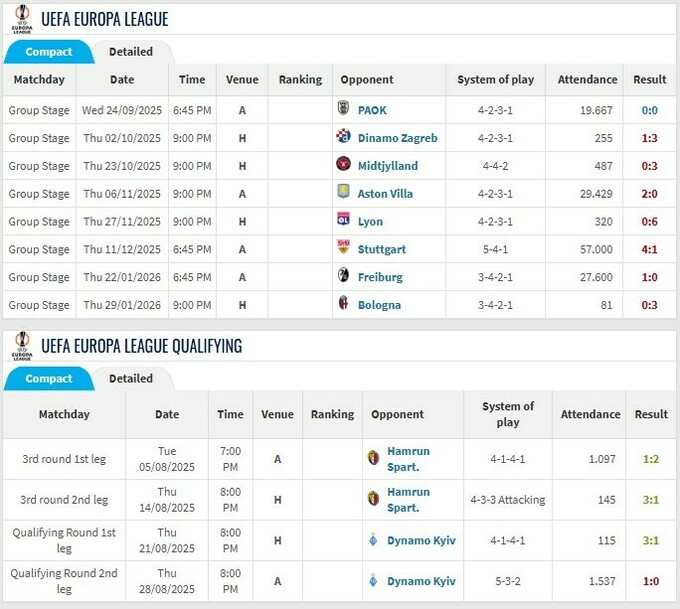 Результаты Маккаби Тель-Авив в Лиге Европы 2025/26 (1 ничья, 7 поражений)
