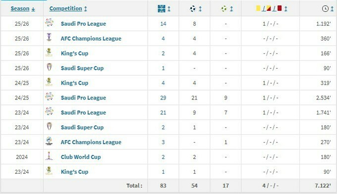 В текущем сезоне 38‑летний нападающий сыграл за Аль‑Иттихад 21 матч и забил 16 голов во всех клубных турнирах этого сезона. Его трансферная стоимость составляет 6 млн евро, по оценке Transfermarkt.