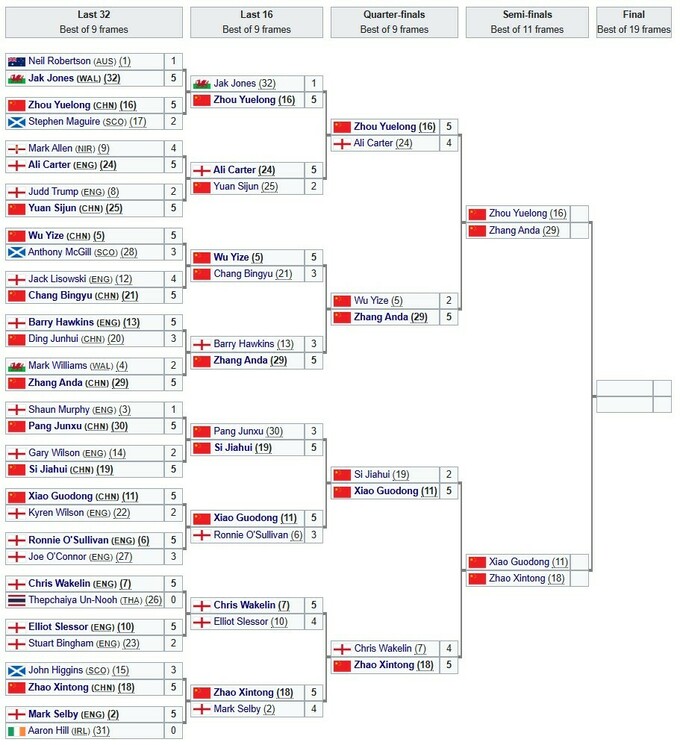 - Чжоу Юэлун (Китай) – Али Картер (Англия) – 5:4