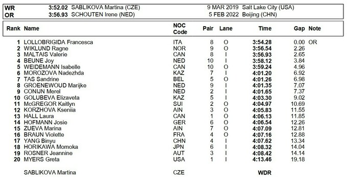 На дистанции 3000 метров 35-летняя Лоллобриджида, которая в прошлом году вернулась на лед после декретного отпуска, почти всю гонку держала второй-третий результат, но на последних двух кругах ускорилась и не только выиграла гонку, но и установила новый олимпийский рекорд - 3.54.280. Предыдущее достижение, которое в китайском Пекине четыре года назад установила Ирейне Схаутен из Нидерландов, итальянка обновила на 0.39 секунды.