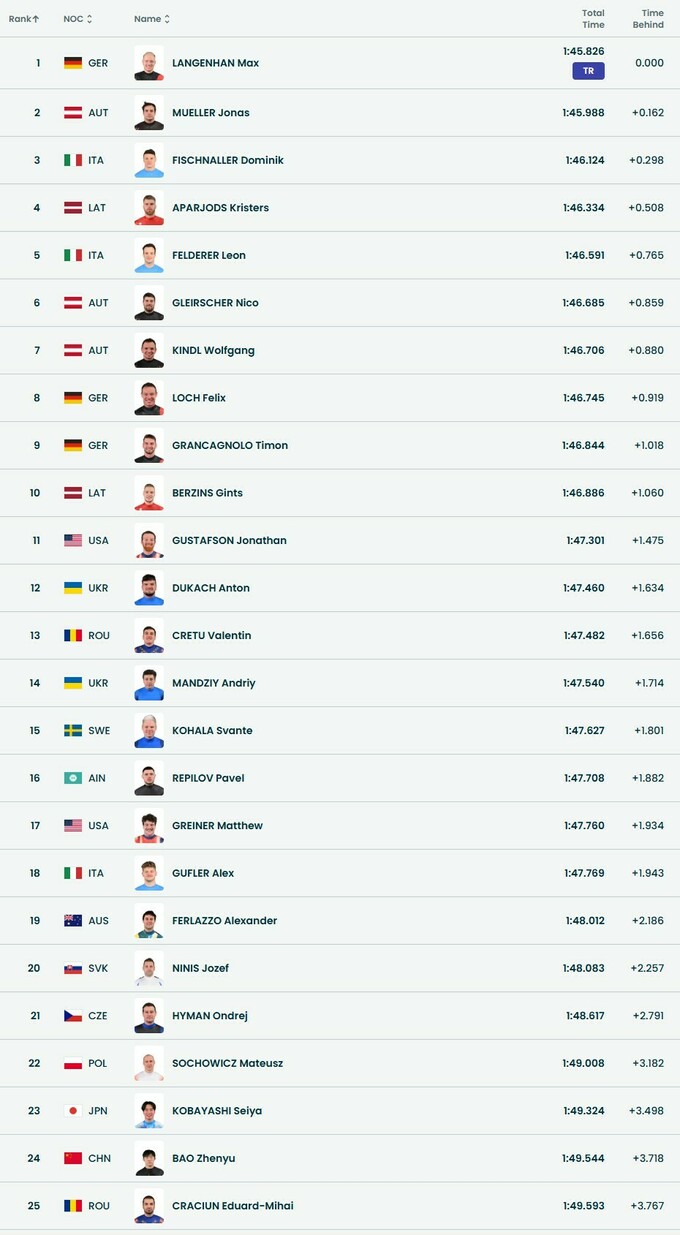 Лидером соревнований после двух заездов является немец Макс Лангенхан, который показал суммарное время 1:45.826 и установил рекорд трассы. Второе место занимает австриец Йонас Мюллер (+0.162), третье – итальянец Доминик Фишналлер (+0.298).