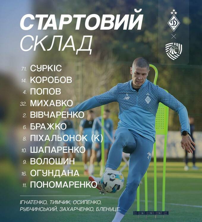 Динамо: Суркис, Коробов, Попов, Михавко, Вивчаренко, Бражко, Пихаленок (кап), Шапаренко, Волошин, Огундaна, Пономаренко