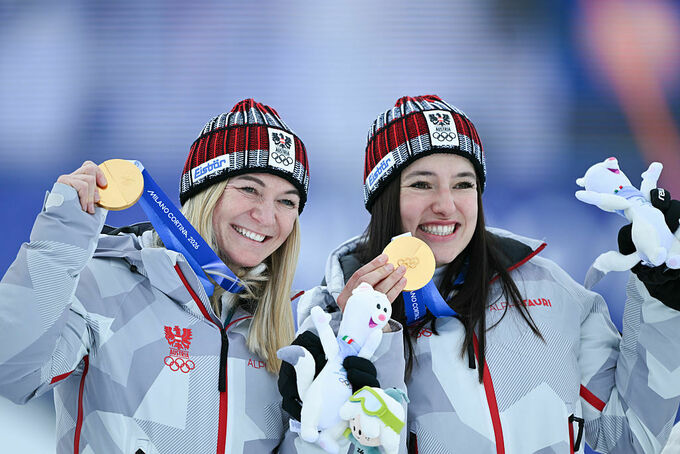 А золото завоевали австрийки. 31-летняя мастер скоростного спуска Ариане Редлер за семь сезонов в Кубке мира всего дважды поднималась на подиумы, оба раза став второй в супергиганте. 30-летняя слаломистка Катарина Хубер личных подиумов Кубка мира не имела вообще, но стала олимпийской чемпионкой Пекина в командном первенстве. Другими словами, этот дуэт на фоне топовых соперниц из США, Швейцарии, Италии, Германии и землячек-австрийок, мягко говоря, не выделялся. Но Редлер и Хубер провели явно лучшие гонки в жизни и сенсационно завоевали золото. Серебро добыли немки Кира Вайдле-Винкельманн и Эмма Айхер, которая на этих Играх уже выигрывала серебро в скоростном спуске, а сегодня выступала в слаломе. Бронзу завоевали американки Жакелин Уайлз и Паула Мольтзан.