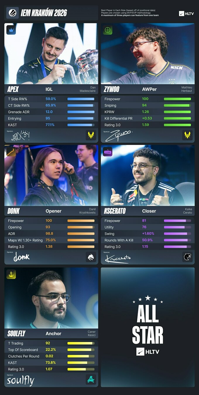В символическую сборную турнира также вошли Даниил «donk» Крышковец и Ден «apEX» Мадесклер. Роль клатчера получил Кайке «KSCERATO» Серато, опередив Лотана «Spinx» Гилади и Робина «ropz» Коля.