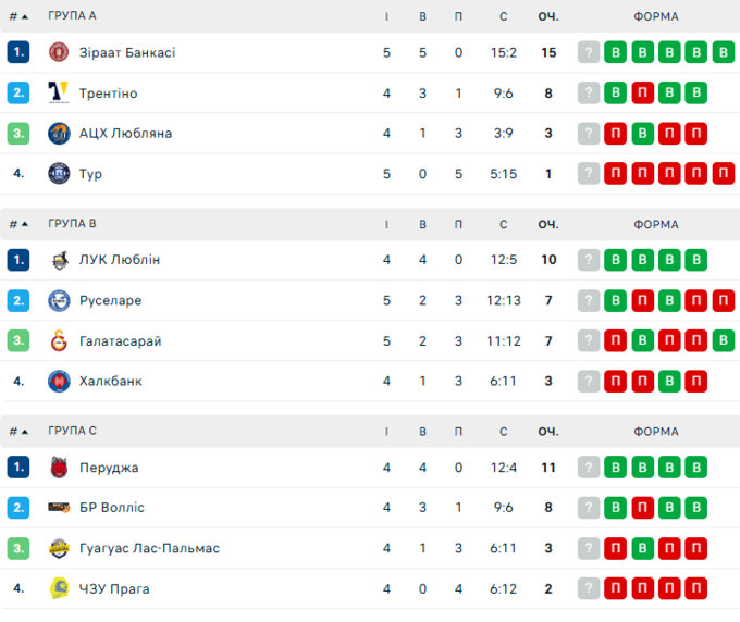 В следующем матче Зираат Банкасы уверенно обыграл французский Тур со счетом 3:1. Представитель Турции выделился, набрав максимум очков в 5 матчах – 15.