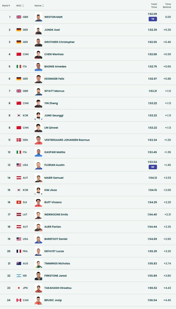 Второе место занимает немец Аксель Юнг – 1:52.39 (+0.30). Тройку замыкает еще один представитель Германии Кристофер Гротхер – 1:52.55 (+0.46).