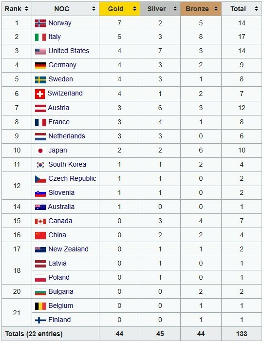 Италия имеет 6 золотых медалей, на одну меньше, чем получила Норвегия