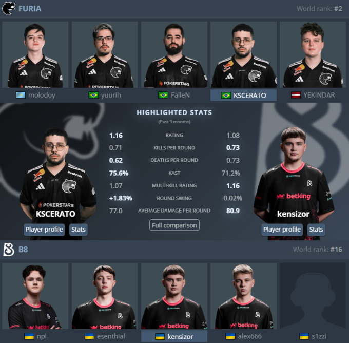 B8 подходят к этой встрече с кадровыми изменениями. Команда недавно представила нового снайпера, которого, по словам клуба, бесплатно арендовала из молодежного состава Team Spirit Academy. Для игрока это шанс проявить себя на высоком уровне, а для украинского коллектива – возможность освежить игру и добавить огневой мощи.