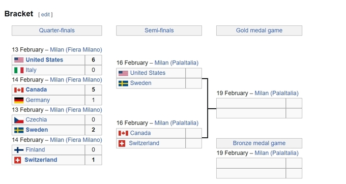 В итоги в полуфиналах 16 февраля сыграют США – Швеция и Канада – Швейцария.
