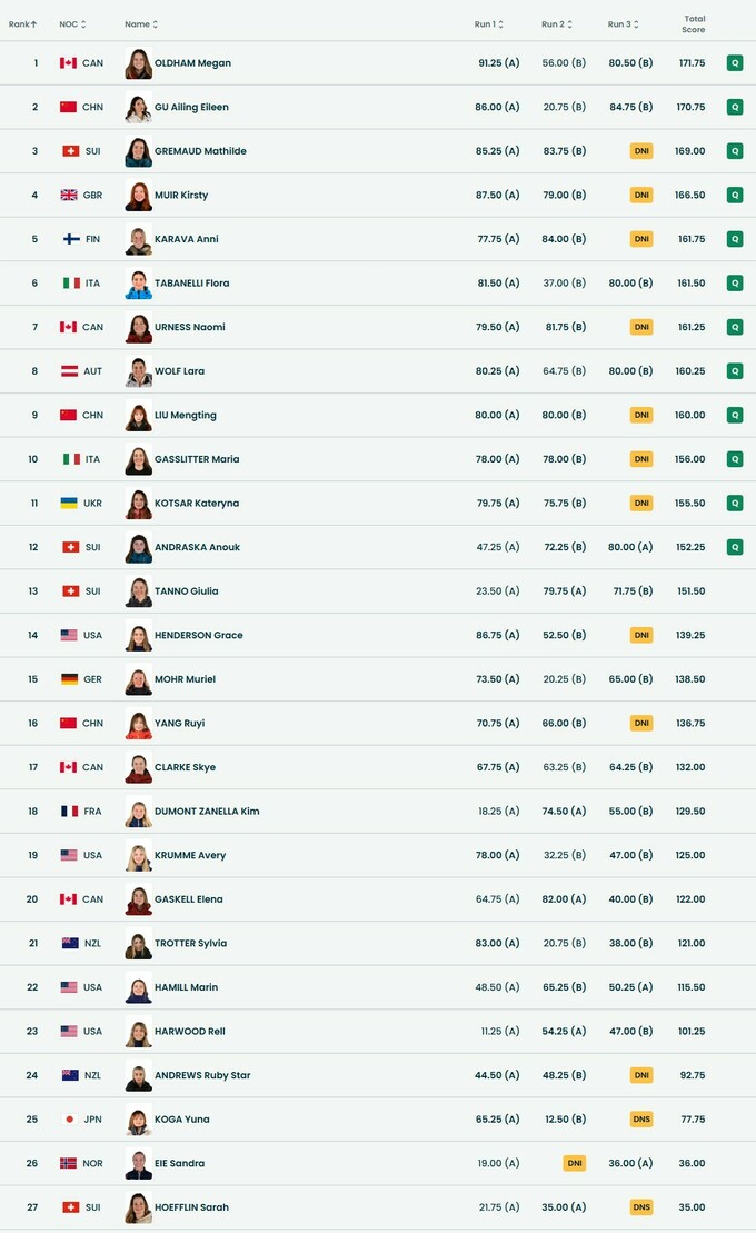 Первое место в квалификации заняла канадка Меган Олдхем (171.75). Второй финишировала Айлин Гу из Китая (170.75), третьей – швейцарка Матильда Гремо (169.00).