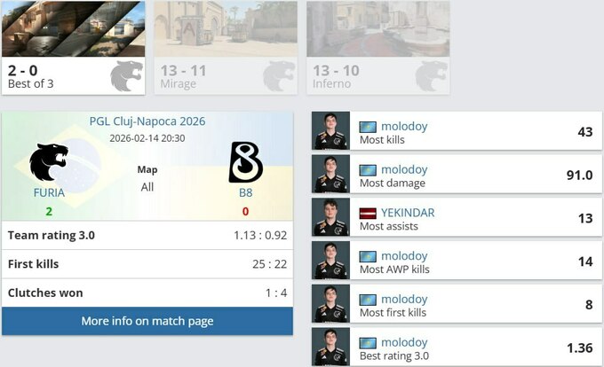 На выборе B8 – Mirage – «s1zzi» показал солидный рейтинг 1.19 и стал лучшим игроком своей команды по статистике. Несмотря на это, FURIA сумели вырвать карту со счетом 13:11 в упорной борьбе.