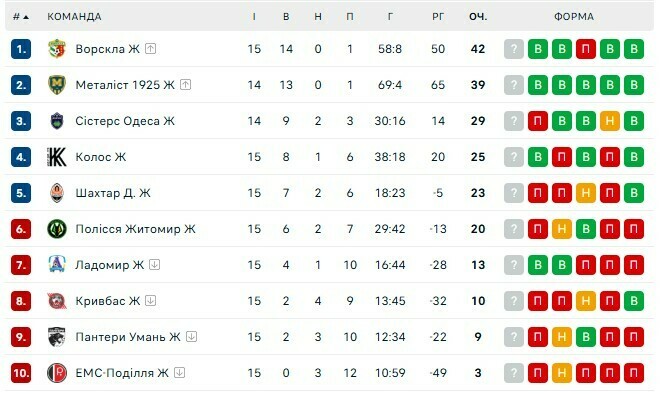 Турнирное положение: Ворскла Полтава (42 очка), Металлист 1925 Харьков (39), Систерс Одесса (29), Колос Ковалевка (25), Шахтер Донецк (23), Полесье Житомир (20), Ладомир Владимир (13), Кривбасс Кривой Рог (10), Пантеры Умань (9), ЕМС-Подолье Винница (3).