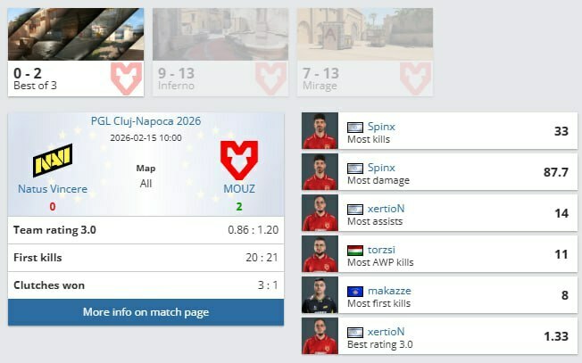 Команда Natus Vincere потерпела поражение от MOUZ во втором матче группового этапа PGL Cluj-Napoca и опустилась в пул 1-1. «Рожденные побеждать» уступили со счетом 0:2 — 9:13 на Inferno и 7:13 на Mirage.