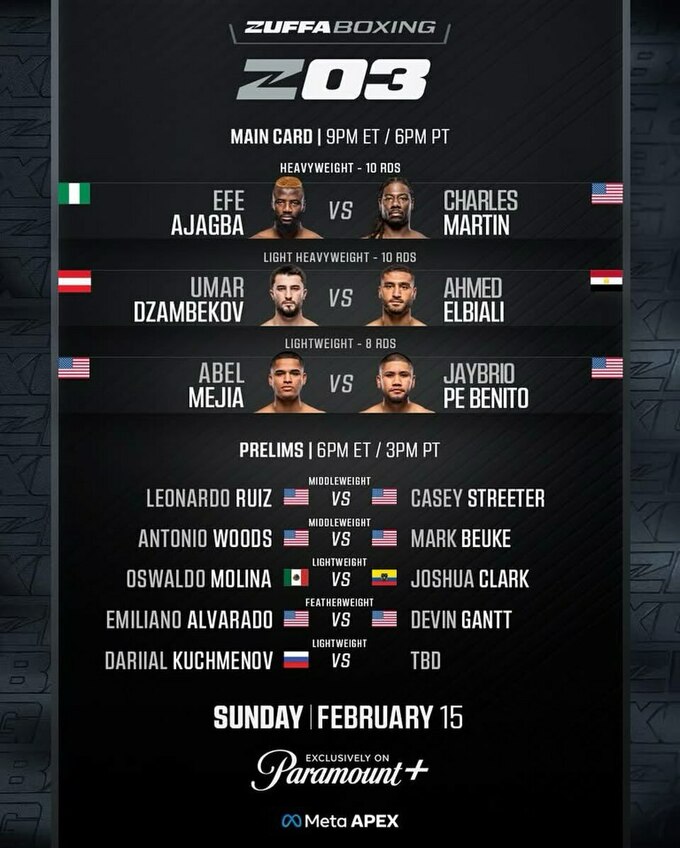В ночь на 16 февраля на арене «Meta Apex» в американском Лас-Вегасе состоится масштабный вечер бокса Zuffa Boxing 03, организованный при поддержке Дэйны Уайта и Турки Аль-Шейха.