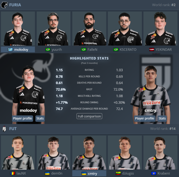 Предыдущие очные встречи FUT и FURIA уже показали, что бразильцы способны создавать проблемы даже молодым перспективным командам. Для FUT этот матч станет очередным испытанием и возможностью «отомстить» за B8, доказать, что их успешный старт в Клуж-Напоке не случаен, и подняться выше в турнирной таблице группы.