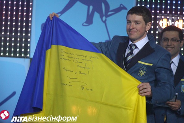 Президент также вручил национальный флаг с поздравительной надписью лыжнику Роману Лейбюку.