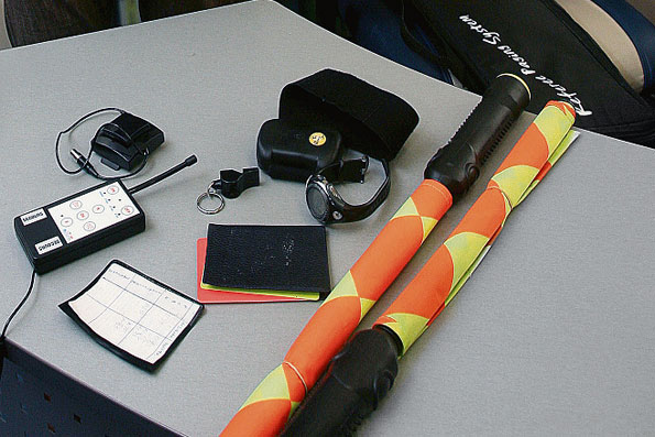 Орехов: «Самое технологически навороченное средство современного рефери — переговорное устройство. В Украине пока всего лишь один такой комплект, что объясняется его дороговизной. Средняя цена — 5000 евро. Гарнитура с микрофоном и наушником — лишь видимая часть системы. Каждый арбитр надевает себе на руку еще специальное передающее устройство. А у четвертого рефери еще пристегнута специальная кнопка для вызова главного — чтобы не «засорял эфир», но имел выход в него, когда надо. Кроме того, арбитр в поле одевает специальный пояс с карманами, в которые вкладывает вспомогательные блоки системы. Судья получается опутан проводками, и, например, известного немецкого рефери Герберта Фанделя это пугало. Он отказывался надевать на себя все эти штучки в дождливую погоду, опасаясь электрического разряда.