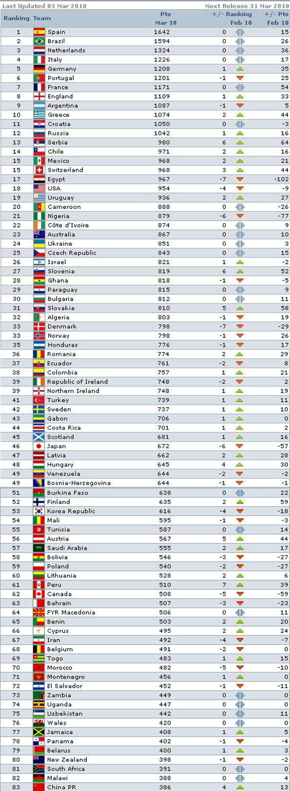 ФИФА опубликовала новый рейтинг сильнейших сборных мира. Испания, как и месяц назад, занимает в списке первую позицию. В пятерку «сильнейших» ворвалась Германия, опередив Португалию. Стоит также отметить заметный подъем Сербии и Словении на шесть строчек вверх. Наши соседи поляки - лишь на 59 месте.