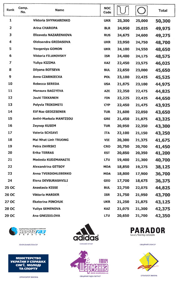 Участницы соревновались в упражнениях со скакалкой и обручем. Лучший результат показала украинка Виктория Шинкаренко.