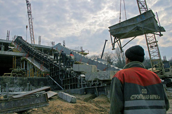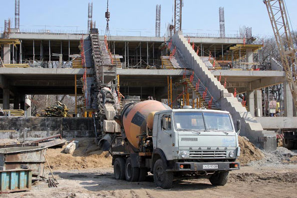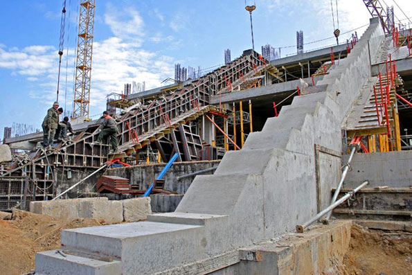 Наконец-то установившаяся теплая погода позволила активизировать процесс заливки бетона на технологически сложных участках. Сейчас интенсивно ведется изготовление наклонных опорных конструкций для перекрытия восточных трибун арены.