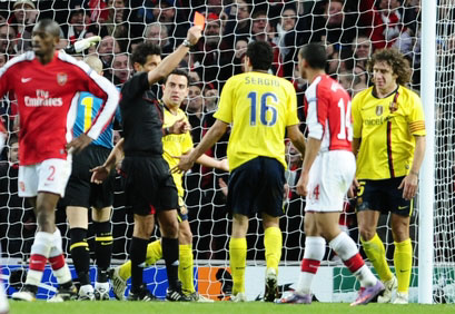 «Барселона» после пропущенного гола пыталась сосредоточиться на контроле мяча, «Арсенал» же всеми силами хотел отыграться, вот и началась подобная несогласованность взглядов целой россыпью «горчичников», а закончилась сомнительным пенальти в ворота «блаугранас» на последних минутах матча. По мячу, зависшему над штрафной, пытался попасть Фабрегас, сзади набежал Пуйоль… Арбитр достал красную карточку и указал на «точку», однако, возможно, что фол был как раз со стороны Сеска, на замахе зацепившего защитника «Барсы», да и до мяча игроку «Арсенала» в любом случае трудновато было дотянуться.